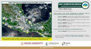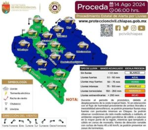 Boletin Estado Municipios Pichucalco El Gobierno Municipal de Pichucalco, CONAGUA y la Secretaría de Protección Civil pronóstican lluvias fuertes a muy fuertes acompañadas de descargas eléctricas, rachas de viento de 30 a 40 km/h. Saul Galdamez agosto 16, 2024