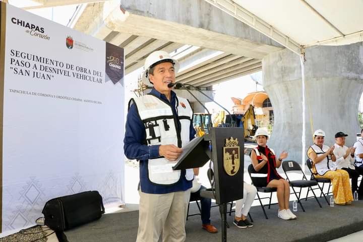 El gobernador Rutilio Escandón Cadenas realizó un recorrido de supervisión de la construcción del Paso a Desnivel Vehicular “San Juan” del municipio de Tapachula, donde constató que los trabajos de esta obra emblemática y de alto impacto social registran un avance del 83 por ciento, y se espera que esté concluida en el mes de septiembre de este año.