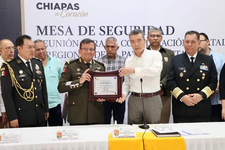 En el marco de la Mesa de Seguridad, el gobernador Rutilio Escandón Cadenas entregó reconocimientos al comandante de la VII Región Militar, José Joaquín Jiménez Cueto; al comandante de la 16ª Región Naval, Octavio Trejo Hermida, y al coordinador estatal de la Guardia Nacional en Chiapas, Antonio Hernández Tejeda, por su colaboración para la seguridad, estabilidad y bienestar del pueblo de Chiapas.