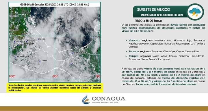 CONAGUA y la Secretaría de Protección Civil Municipal de Pichucalco; Informan que en las próximas horas, se pronostican lluvias fuertes a puntuales con descargas eléctricas en las inmediaciones de Chiapas y la Zona Norte.