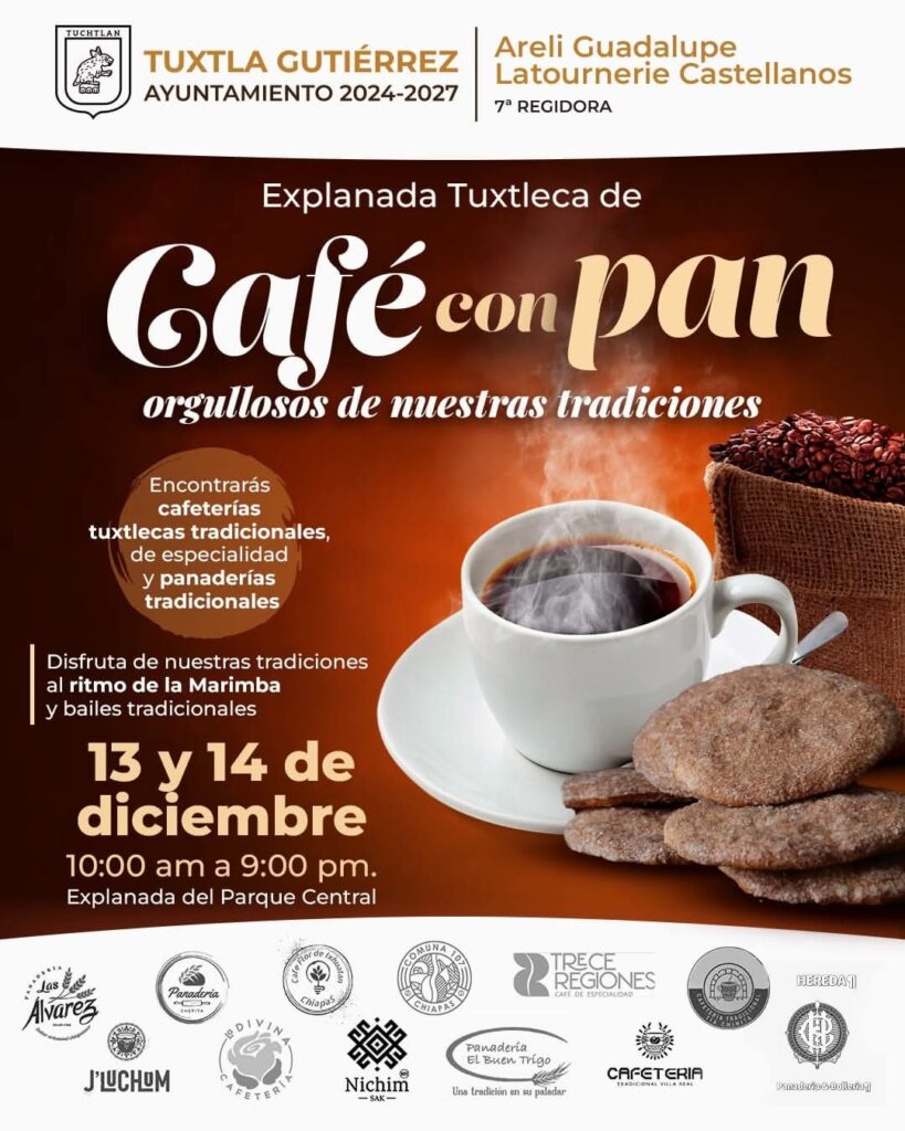 El Ayuntamiento de Gutiérrez y la Séptima Regidora Areli Guadalupe Latournerie Castellanos invitan a la Explanada Tuxtleca de Café con Pan el próximo 13 y 14 de diciembre en el Parque Central, de 10 de la mañana a 9 de la noche.