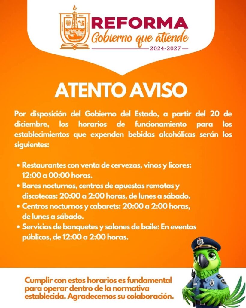 El Ayuntamiento de Reforma, presidido por Pedro Ramírez, informa sobre nuevos horarios para establecimientos que venden bebidas alcohólicas a partir del viernes 20 de diciembre.