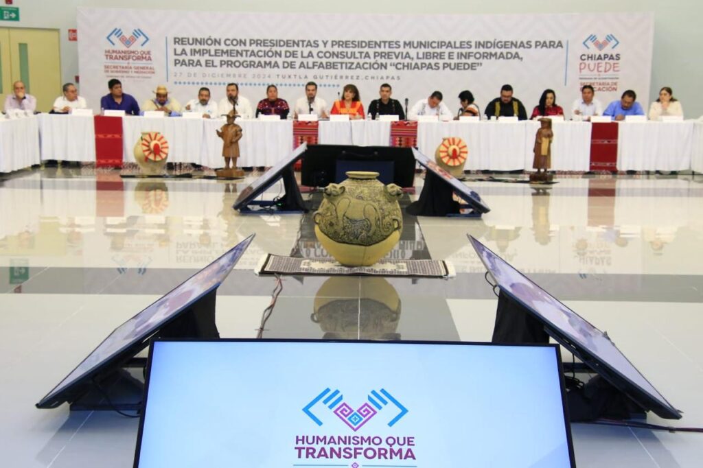 Tuxtla Gutiérrez.- Con el objetivo de dar a conocer la implementación de la Consulta Previa, Libre e Informada, respecto al programa de alfabetización “Chiapas Puede”, los secretarios de Educación, Roger Mandujano Ayala y la secretaria general de Gobierno y Mediación, Patricia del Carmen Conde Ruiz, encabezaron este viernes un encuentro con los presidentes de los 53 municipios indígenas de la entidad y el presidente de la Mesa Directiva del Congreso del Estado, Luis Ignacio Avendaño Bermúdez.