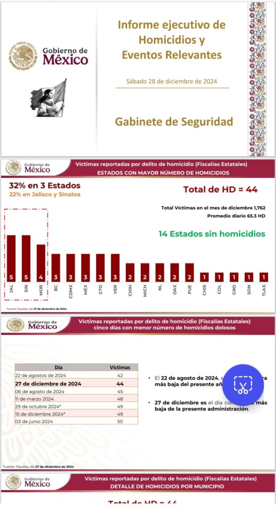 28 de diciembre de 2024. La Secretaría de Seguridad y Protección Ciudadana (SSPC) , que es dirigida por el secretario Omar García Harfuch, reveló que el día de ayer viernes 27 de diciembre se registró el día con menos homicidios dolosos en el gobierno de la Presidenta Claudia Sheinbaum, con un total de 44.