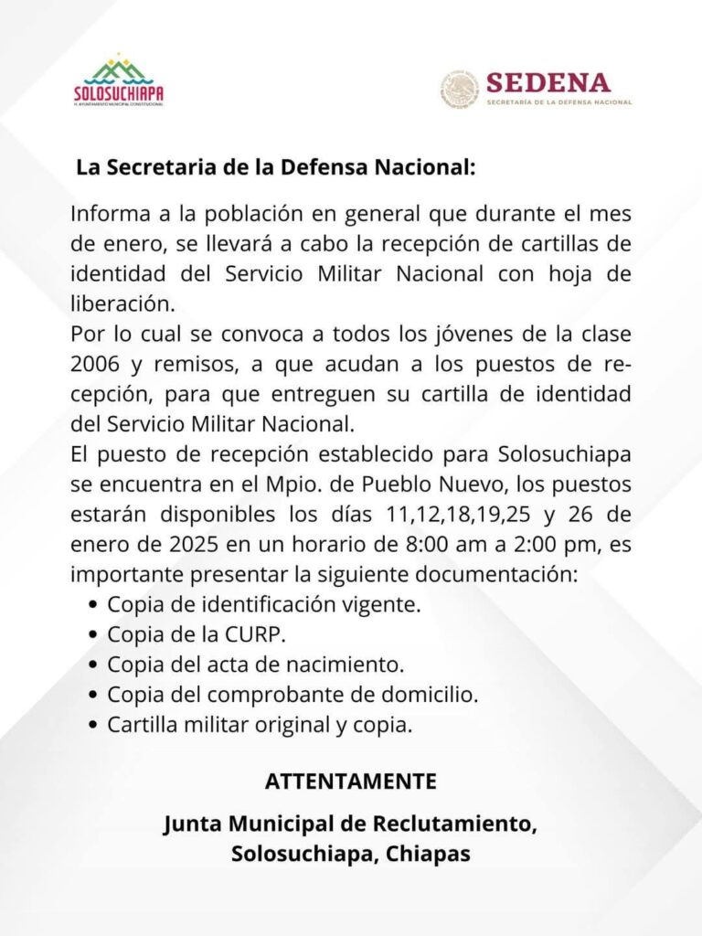 La Secretaría de Defensa Nacional, a través del H. Ayuntamiento de Solosuchiapa, informa a todos los ciudadanos que pueden pasar a hacer entrega de su cartilla de identidad del Servicio Militar Nacional con hoja de recepción, en el corredor del Palacio Municipal de Pueblo Nuevo, Solistahuacán.