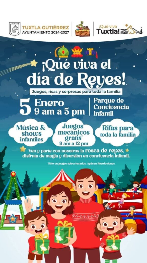 El Ayuntamiento de Tuxtla Gutiérrez, que encabeza el presidente municipal Angel Torres, invita a las familias a disfrutar del evento denominado ¡Qué viva el día de Reyes!, este 5 enero, a partir de las 9 de la mañana a 5 de la tarde en el parque de Convivencia Infantil.
