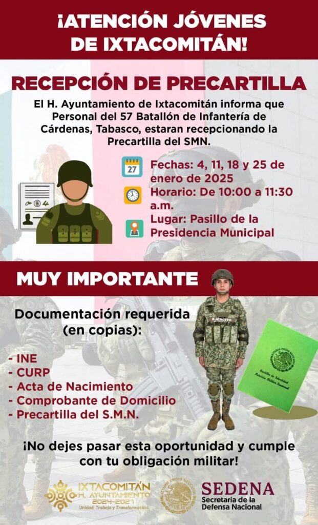 El Gobierno Municipal de Ixtacomitan, que preside el Ing. Miguel Angel Moreno Palacios en coordinación con la Secretaría Municipal informa a los jóvenes que realizaron el trámite de precartilla en 2024 que la recepción de la Cartilla Militar se llevará a cabo Hoy y los días 4, 11, 18 y 25 de enero de 2025, en un horario de 10 am a 11:30 am , en los pasillos del Palacio Municipal.
