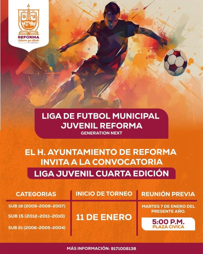 El gobierno municipal de Reforma, que dirige Pedro Ramírez, está organizando la 4.ª edición de la Liga Municipal de Fútbol Juvenil, dirigida a jóvenes de 15 a 21 años en diversas categorías.