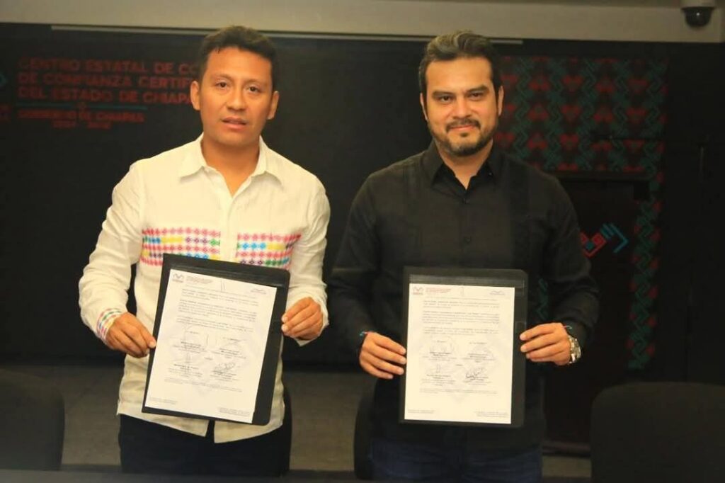Tuxtla Gutiérrez.- La Secretaría de Educación (SE) y el Centro Estatal de Control y Confianza Certificado del Estado de Chiapas (CECCC), que encabezan Roger Mandujano Ayala y José Alonso Llaven Villareal, respectivamente, firmaron un convenio de colaboración institucional.