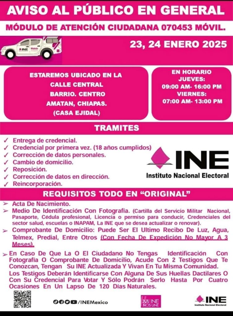 ¡Atención, ciudadanos de Amatán! El Módulo de Atención Ciudadana Móvil del INE estará en nuestro municipio los días 23 y 24 de enero.
