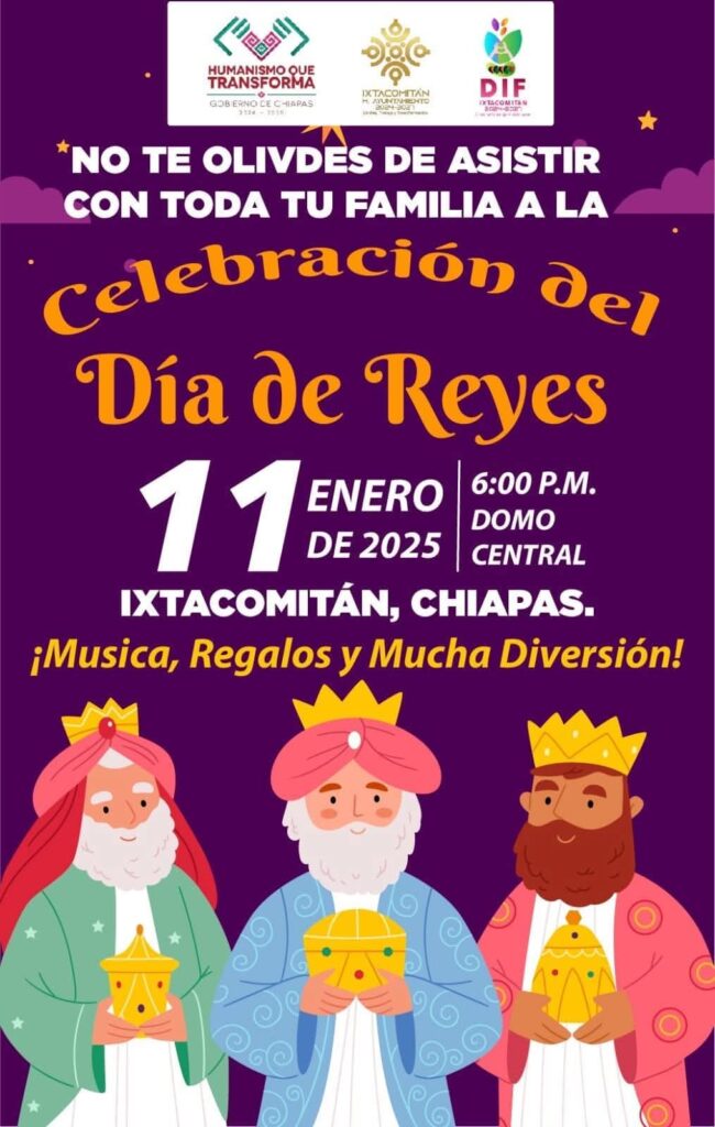 El presidente municipal de Ixtacomitán, Miguel Ángel Moreno Palacios, te invita a celebrar el Día de Reyes en la Plaza Central de Ixtacomitán el 11 de enero a las 6:00 pm. Prepárate para una tarde llena de diversión, alegría y sorpresas para los más pequeños.