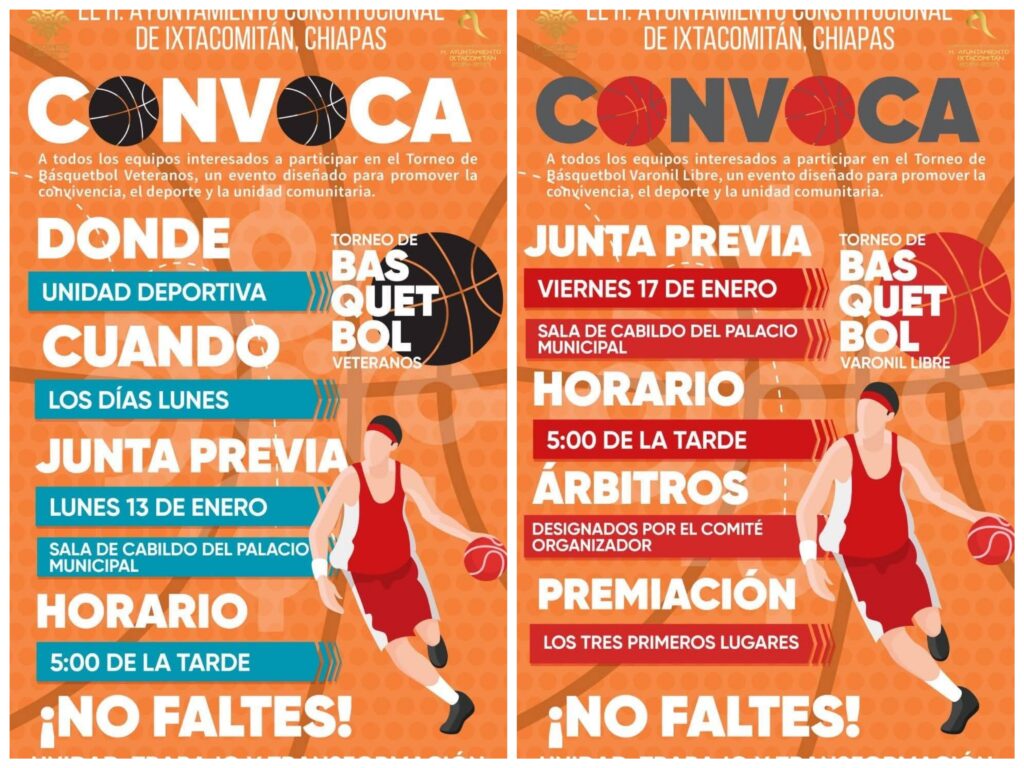 Ayuntamiento de Ixtacomitan invita al torneo de Básquetbol categoría libre y Veteranos