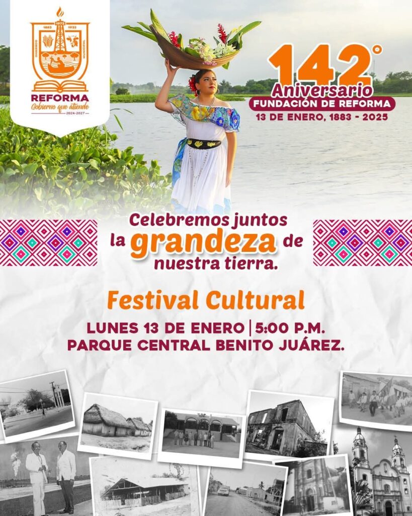El Ayuntamiento de Reforma, Chiapas, encabezado por Pedro Ramírez, te invita a unirte a las celebraciones del 142º aniversario de la fundación del municipio. Se llevará a cabo un festival cultural el lunes 13 de enero a las 5:00 p.m. en el Parque Central Benito Juárez.