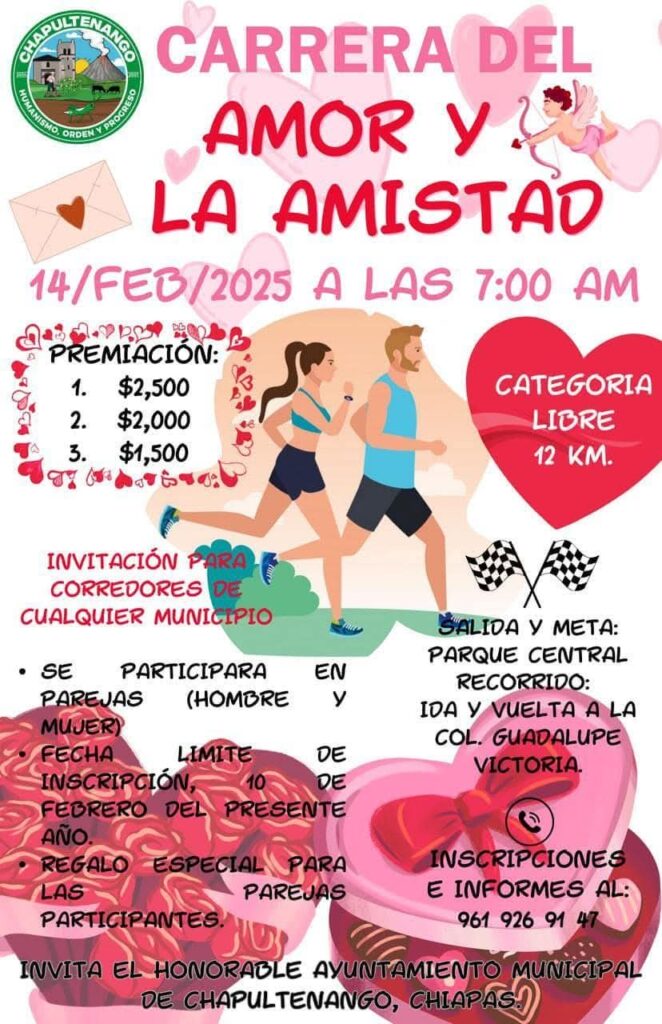 El gobierno municipal de Chapultenango, encabezado por Amancio Federico Lucas Hernández, te invita a participar en la gran Carrera del Amor y la Amistad el próximo 14 de febrero.