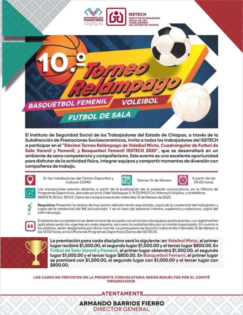 El Instituto de Seguridad Social de los Trabajadores del Estado de Chiapas (Isstech), bajo la dirección de Armando Barrios Fierro, llevará a cabo la Décima Edición de los Juegos de la Amistad, con el propósito de fomentar la convivencia, la salud y el bienestar entre la comunidad trabajadora del Instituto.