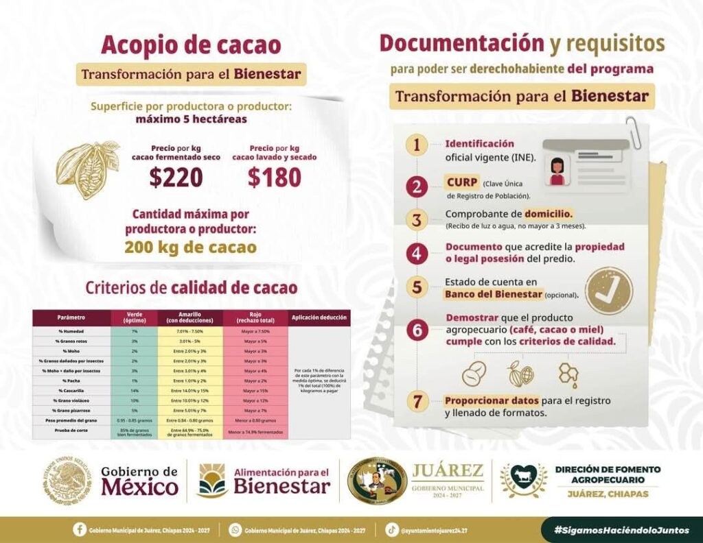 Con el objetivo de fortalecer la economía del sector cacaotero y garantizar precios justos para los productores locales, el Gobierno Municipal que encabeza Oscar Serra Cantoral, en coordinación con la Dirección de Fomento Agropecuario, invita a todas y todos los productores de cacao del municipio a sumarse a la convocatoria impulsada por el Gobierno de México, a través de la Secretaría de Agricultura y Desarrollo Rural, en el marco del programa Alimentación para el Bienestar.