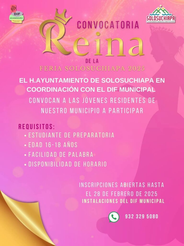 El DIF Municipal de Solosuchiapa, en coordinación con el H. Ayuntamiento que preside Fernando Aparicio Gómez, invita a todas las jóvenes de entre 16 y 18 años a participar en la convocatoria para elegir a la Reina de la Feria Solosuchiapa 2025.