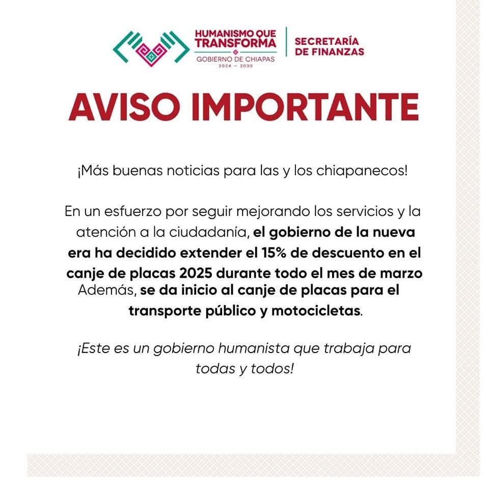 En un esfuerzo por seguir mejorando los servicios y la atención a la ciudadanía, 𝐞𝐥 𝐠𝐨𝐛𝐢𝐞𝐫𝐧𝐨 𝐝𝐞 𝐥𝐚 𝐧𝐮𝐞𝐯𝐚 𝐞𝐫𝐚 𝐡𝐚 𝐝𝐞𝐜𝐢𝐝𝐢𝐝𝐨 𝐞𝐱𝐭𝐞𝐧𝐝𝐞𝐫 𝐞𝐥 𝟏𝟓% 𝐝𝐞 𝐝𝐞𝐬𝐜𝐮𝐞𝐧𝐭𝐨 𝐞𝐧 𝐞𝐥 𝐜𝐚𝐧𝐣𝐞 𝐝𝐞 𝐩𝐥𝐚𝐜𝐚𝐬 𝟐𝟎𝟐𝟓 𝐝𝐮𝐫𝐚𝐧𝐭𝐞 𝐭𝐨𝐝𝐨 𝐞𝐥 𝐦𝐞𝐬 𝐝𝐞 𝐦𝐚𝐫𝐳𝐨. Además, se da inicio al canje de placas para el 𝐭𝐫𝐚𝐧𝐬𝐩𝐨𝐫𝐭𝐞 𝐩𝐮́𝐛𝐥𝐢𝐜𝐨 𝐲 𝐦𝐨𝐭𝐨𝐜𝐢𝐜𝐥𝐞𝐭𝐚𝐬.