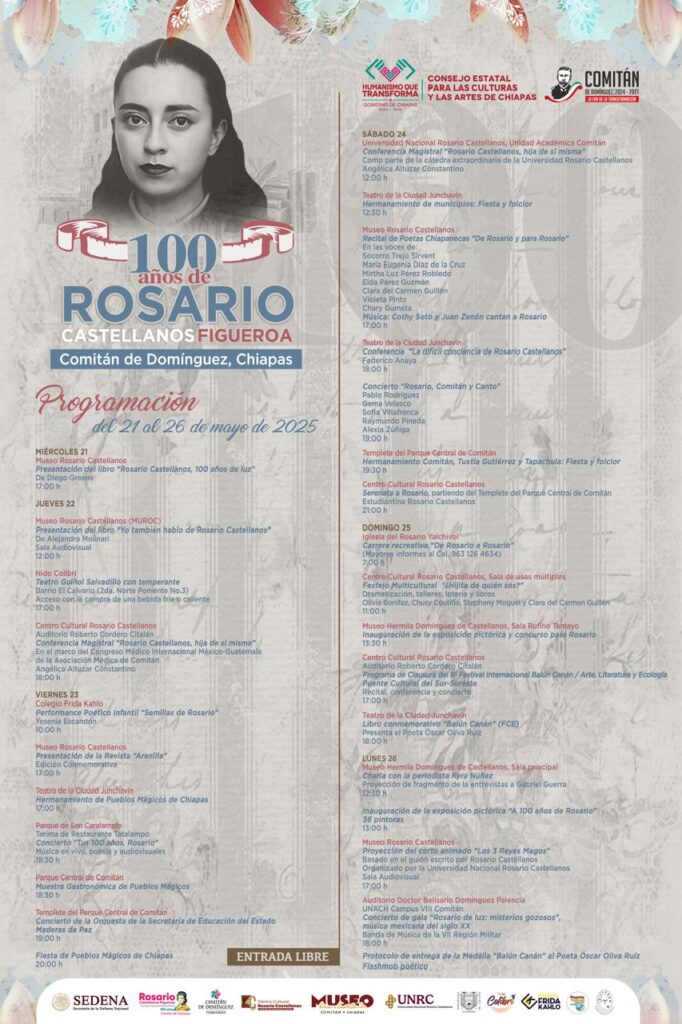 El programa artístico y cultural “100 años de Rosario Castellanos Figueroa”, se llevará a cabo del 21 al 26 de mayo de 2025 en diversos espacios de Comitán de Domínguez, con el objetivo de difundir la vida y obra de la autora de Oficio de tinieblas, además de reflexionar sobre su propuesta literaria que abarcó géneros como la poesía, la narrativa, el cuento y el ensayo.