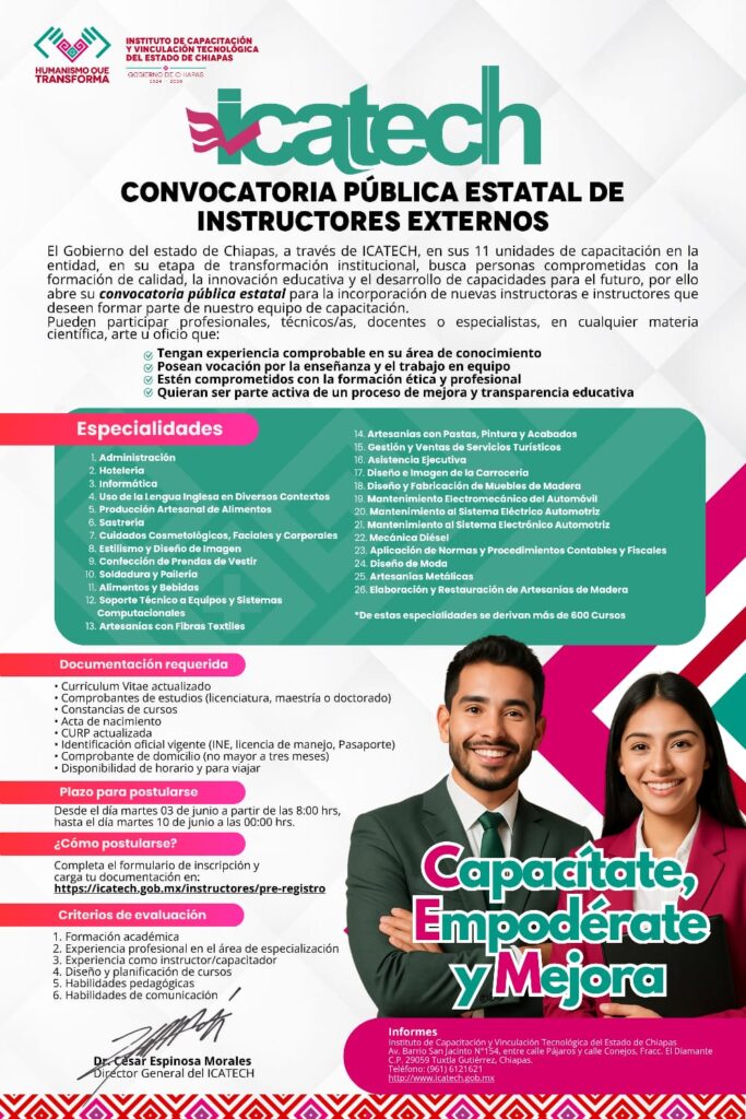 El Instituto de Capacitación y Vinculación Tecnológica del Estado de Chiapas (Icatech), anunció la apertura de su convocatoria pública estatal de instructores externos, dirigida a profesionales interesados en formar parte de un equipo comprometido con el fortalecimiento de habilidades para el trabajo. Esta iniciativa busca sumar talentos que aporten a la formación de más chiapanecas y chiapanecos, con el objetivo de impulsar el desarrollo económico y social de la entidad.