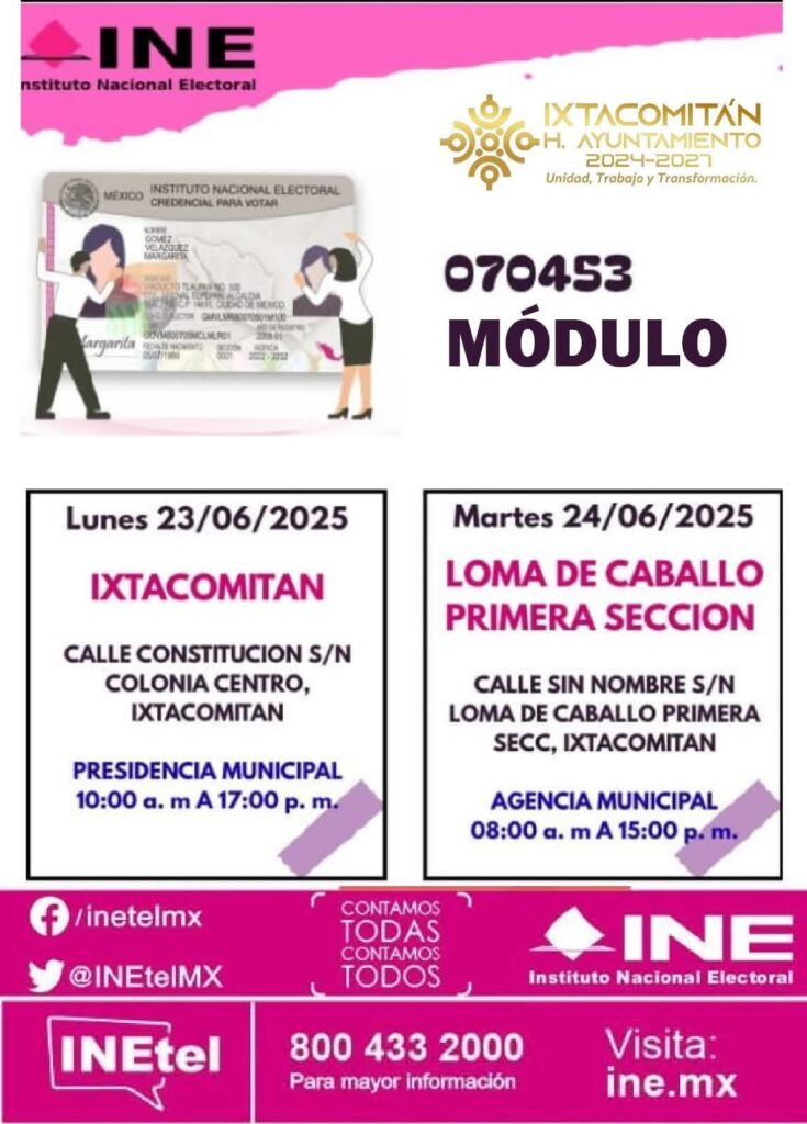Si necesitas hacer algún trámite relacionado con tu credencial, no pierdas esta oportunidad. El módulo del INE estará en el municipio en las siguientes fechas: