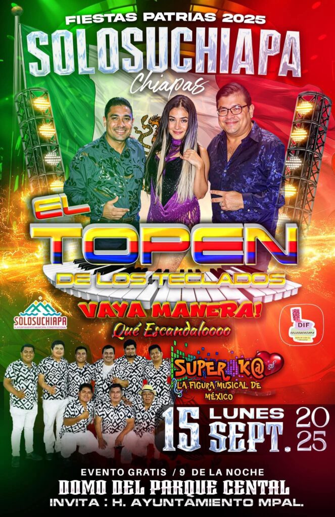 El Honorable Ayuntamiento de Solosuchiapa, que preside el Ing. Fernando Aparicio Gómez te invita al gran baile de las Fiestas Patrias este 15 de septiembre a las 9:00 p.m. en el domo del parque central. 🎶💃🕺