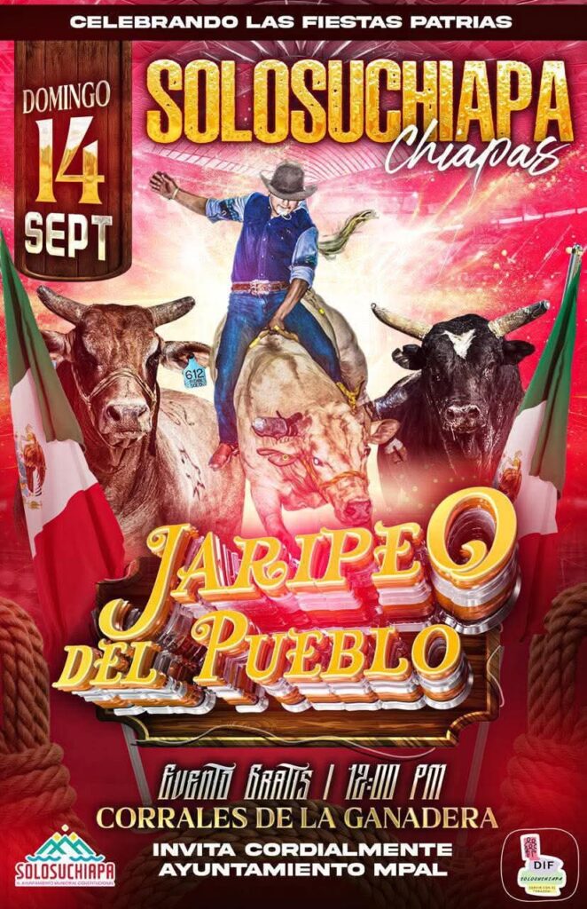 **Solosuchiapa, Chiapas –** El H. Ayuntamiento Municipal de Solosuchiapa invita a toda la comunidad a unirse a la celebración de las Fiestas Patrias con un evento lleno de emoción y tradición: el Gran Jaripeo del Pueblo.