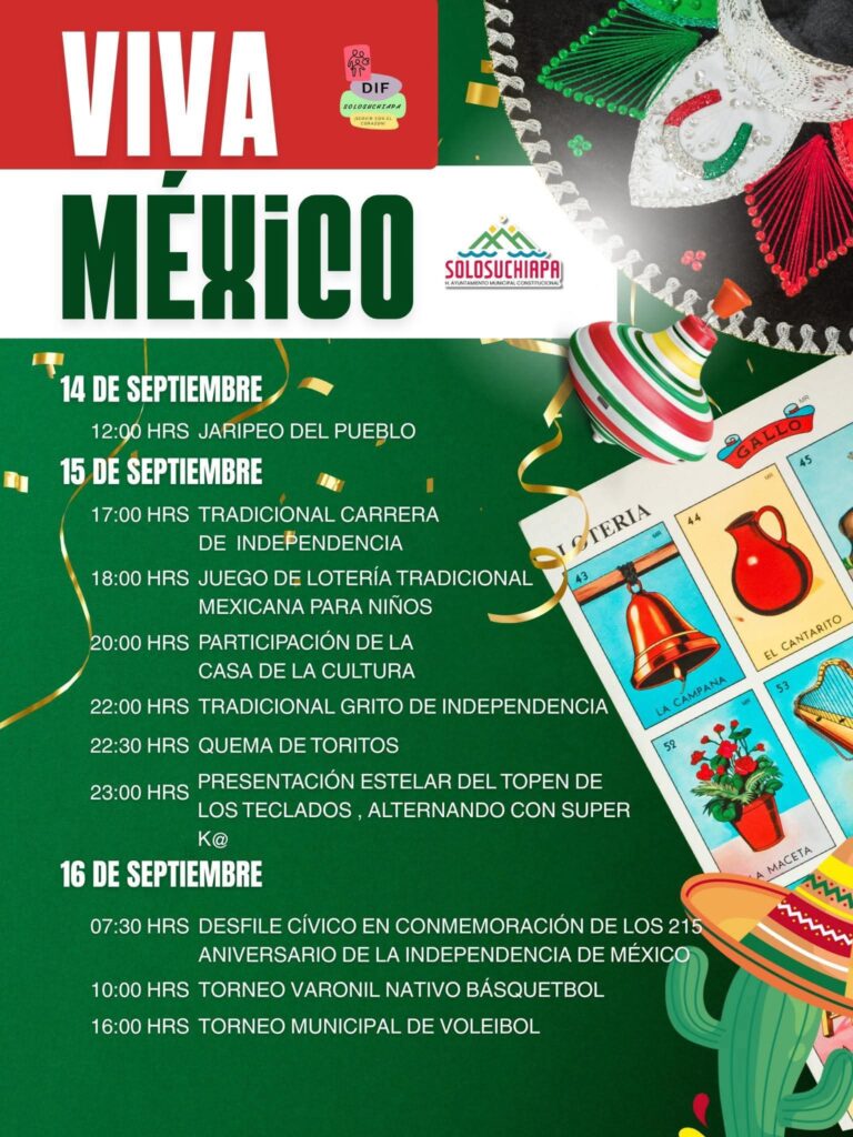 El H. Ayuntamiento de Solosuchiapa, bajo la presidencia del Ing. Fernando Aparicio Gómez, extiende una cordial invitación a toda la comunidad para participar en las festejos conmemorativos por la Independencia de México. Estas celebraciones son una oportunidad para fortalecer nuestras tradiciones y sentir el orgullo nacional.